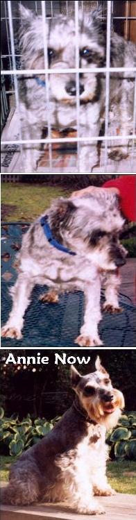 If you have a schnauzer to place or if you are looking for a miniature schnauzer or you need information on available dogs we will try to help you in your search. Email us at: caromike@att.net  These two wonderful boys are looking for a forever home.They are very sweet, well housetrained, and very good with other dogs. One is three and one is four years old. They are very bonded and will not be split up. These boys are very obedient, nice as can be and so easy to be around. Both boys are on the bigger side, but neither one is used to getting on the furniture unless allowed to do so. Adoption donation, application and vet reference and fenced yard required.   Annie's story is presented here to inform people about the reality of puppy mills. Annie is a typical example of the condition of most puppy mill dogs while they are in the puppy mill and when they are all bred out and no longer of any use to the owners. Annie is alive today only because she was rescued rather than being killed, which is the cheapest solution and the usual fate of puppy mill dogs that are no longer profitable. The upper two pictures show Annie as she came from the puppy mill. Since most females are bred every single heat (at least twice a year) from their first heat on which occurs while they are still puppies their bodies become used up and broken down at a very young age. When these pictures were taken of Annie she was only 5 years old. She had many C-sections and the scar tissue was severe, so even though her normal weight for a female her size should have been about 15 lbs, she weighed over 22 lbs--she had been bred so many times that over a third of her body weight was mammary tissue! Annie had produced a litter of puppies that were all born dead two weeks before these photos were taken, and that is why she was to be shot. When she was rescued she had the following conditions, all of which were chronic and of long-standing duration and all of which could have been avoided by proper humane medical care and treatment--routinely not provided by puppy millers because medical care comes directly out of the profits these animals produce and it is cheaper to shoot dogs no longer able to produce than it is to give medical care and treat the dog humanely. Annie Before: Infections in both ears; many rotten teeth (sawdust is routinely mixed with dog food to reduce expenses, and consequently the dogs' teeth rot at an early age because sawdust clings to the gums and teeth and promotes decay---untreated abcessed and rotten teeth promote secondary infections including heart disease, which are not treated); absessed rear paws (all paws have severe scar tissue from wire cage cuts); severe urinary infection; infected uterus (when the veterinarian opened the dog for spaying, parts of the uterus were green, rotten and dying); bladder stones; kidney stones, and one kidney was mostly nonfunctional. All of these conditions were determined to be a result of long standing neglect, lack of medical care and extemely poor nutrition. ANNIE'S CASE IS NOT UNUSUAL. It is the norm. What happened to her puppies? According to the American Humane Association, over 90% of puppies sold in pet stores are from puppy mill moms like Annie. DON'T BUY PUPPIES FROM PETSTORES. Annie Today: Annie was one of a few lucky puppy mill dogs that got rescued. Most are killed (usually shot or drowned, sometimes electrocuted) by their owners before they ever leave the mill.       Miniature Schnauzer Rescue, Please Contact caromike@att.net  |